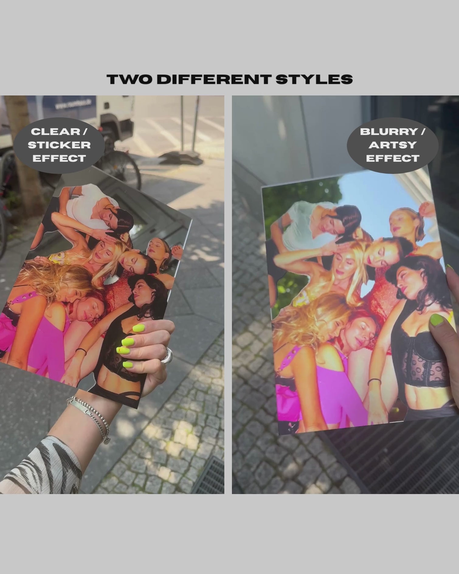Wähle den Stil CLEAR für einen Sticker-Effekt oder BLURRY für einen künstlerischen Effekt, bei dem dein Motiv von der Seite betrachtet verschwimmt. Bei beiden Effekten werden weiße Flächen durchsichtig – der Spiegel scheint an diesen Stellen durch (wie in unseren Videos zu sehen).